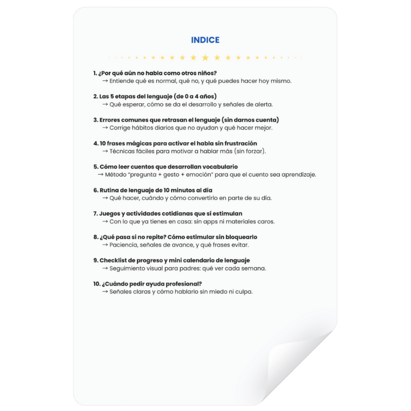 Mi hijo no hablaba casi nada con 2 años. Con esta guía empezamos a jugar, cantar y contar cuentos como explican… y en 3 semanas empezó a decir sus primeras frases. Estoy feliz.