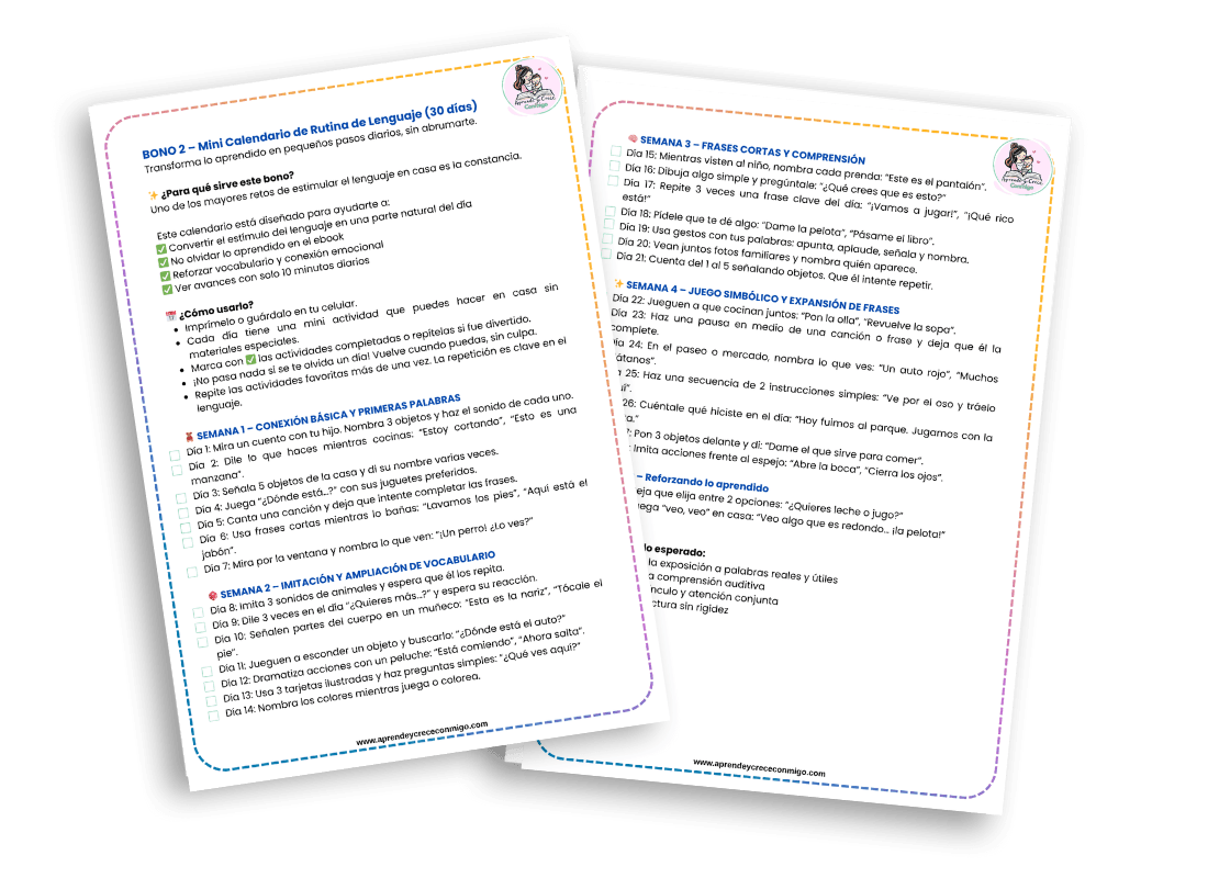 Mi hijo tiene 2 años y apenas decía 2 palabras. Me sentía perdida y culpable. Con esta guía entendí que no era mi culpa, y que sí había cosas que podía hacer desde casa. Empezamos con los juegos y cuentos del pack… y en pocas semanas comenzó a imitar sonidos y a señalar más. ¡Estoy feliz y más tranquila!